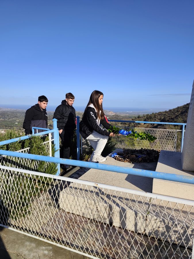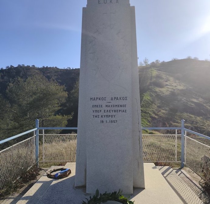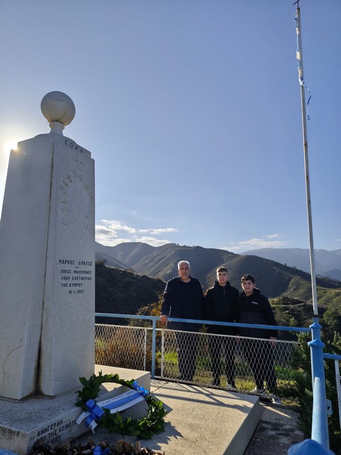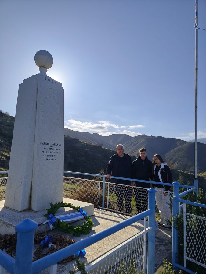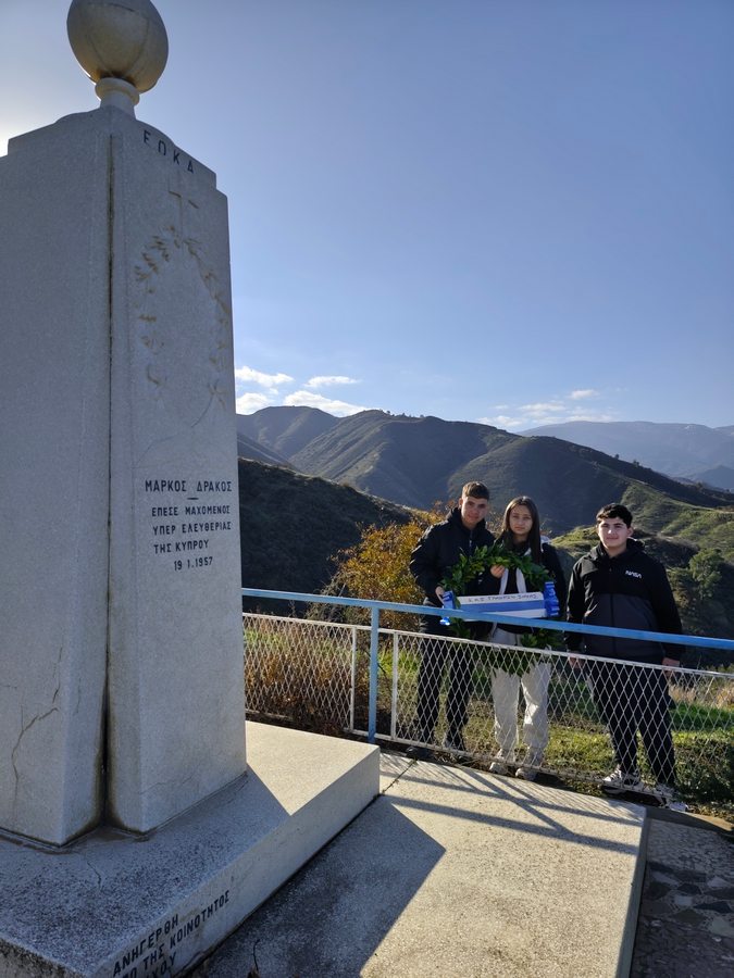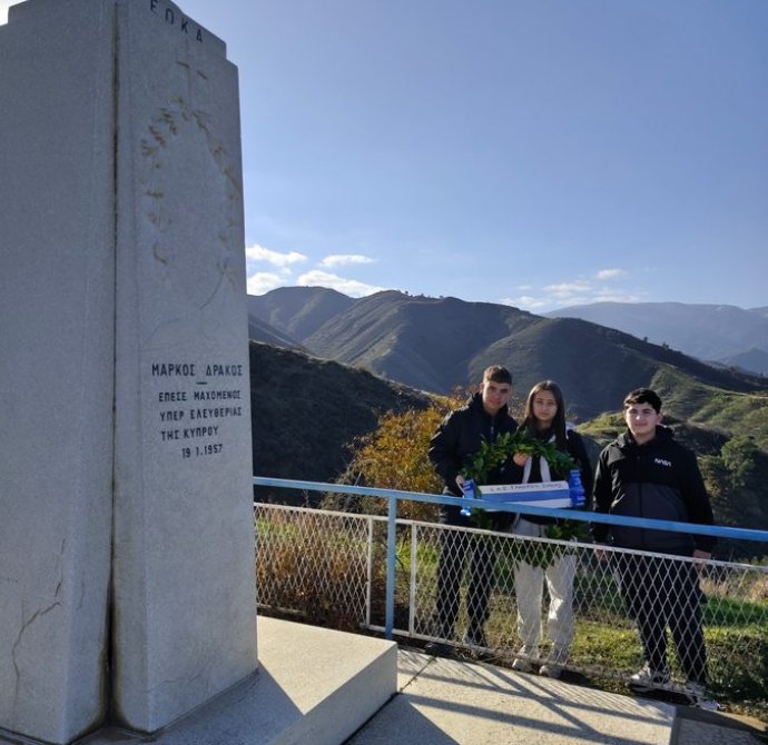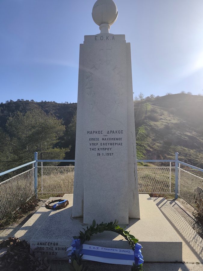 Αντιπροσωπεία του Κεντρικού Μαθητικού Συμβουλίου του Γυμνασίου Σολέας, συνοδευόμενη από τον Διευθυντή κ. Νικόλαο Ζάγγουλο, ανηφόρισε στον χώρο θυσίας του αγωνιστή της ΕΟΚΑ Μάρκου Δράκου για να αποτίσει φόρο τιμής και να καταθέσει στεφάνι στο μνημείο του ήρωα. Ο Μάρκος Δράκος, γνωστός με το ψευδώνυμο «Λυκούργος της ΕΟΚΑ», πέρασε στο πάνθεον των ηρώων σε ηλικία μόλις 25 ετών, τη νύχτα της 18ης Ιανουαρίου 1957, όταν η ομάδα του έπεσε σε ενέδρα Άγγλων στρατιωτών.
